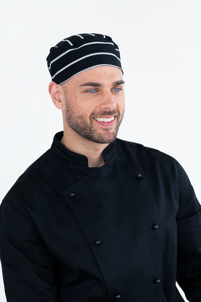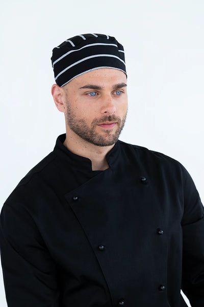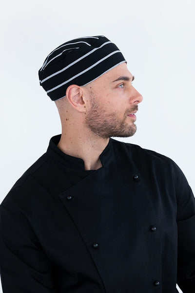 Stay stylish and protected in the kitchen with our Chefs Box Hat in a classic black and white stripe design. Made from durable material, this hat is lightweight and breathable for all-day wear. Perfect for any professional chef or home cook, our box hat offers both fashion and function.